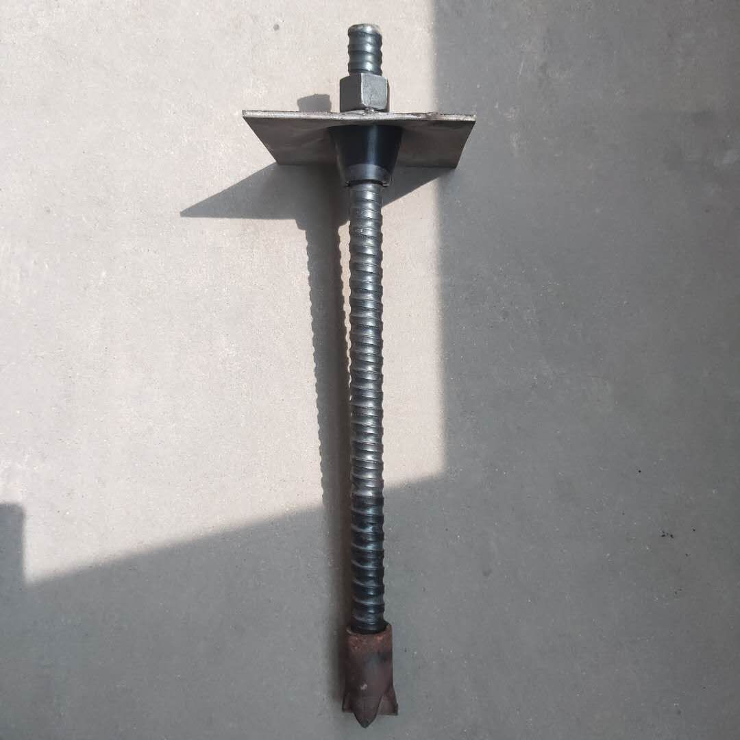 自进式锚杆由杆体(空中全螺纹杆件)、连接套、一次性钻头、拱形垫板、螺母组成。注浆时锚杆尾部可加设橡胶止水浆塞。钻进时锚杆尾部通过连接套加设钎尾(钎尾外形与普通钻杆相同)。